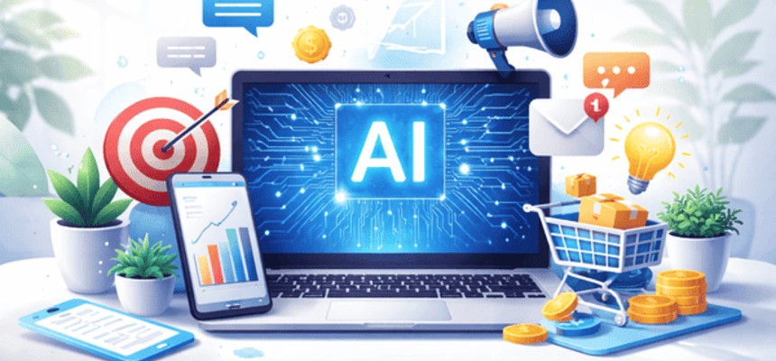 Ilustração de Inteligência Artificial aplicada ao marketing, com elementos digitais e tecnológicos que representam análise de dados, automação e estratégias digitais